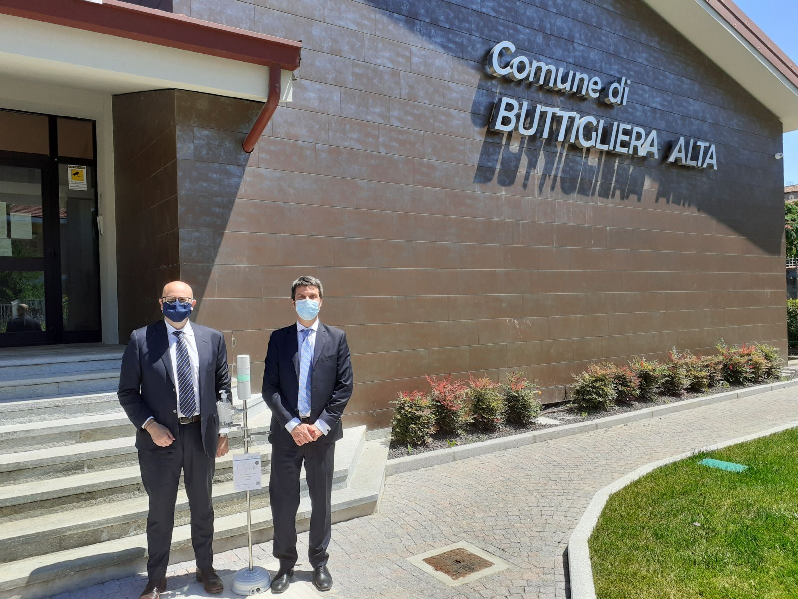 Grazie a una donazione della Sirena Spa, la celebre azienda di Rosta, leader nella progettazione e produzione di apparati elettronici di segnalazione, l’accesso al pubblico agli uffici municipali è ancora più sicuro e organizzato. Sirena ha messo a disposizione del Comune di Buttigliera Alta due impianti segnalatori di coda, in grado di regolamentare, con un semplice sistema luminoso, gli ingressi del pubblico, evitando all’operatore di avvicinarsi per gestire i turni di accesso. Il sistema, semplice quanto efficace, consiste in un piccolo semaforo che accende le sue luci verdi per l’accesso libero e rosso per lo stop e l’attesa del proprio turno, con un telecomando. E’ l’operatore che sta ricevendo il pubblico ad azionare, senza doversi spostare dalla propria postazione, il dispositivo. Si razionalizza così la coda, si accelerano i tempi e soprattutto si mantengono sempre le distanze di sicurezza, previste dai protocolli per la riduzione della diffusione dell’epidemia di Covid-19. Il sistema di segnalazione è installato su una pedana dotata anche di un porta dispenser per il gel necessario per la sanificazione delle mani, dotato di un cartello con le buone prassi da seguire per ridurre le possibilità di contagio.