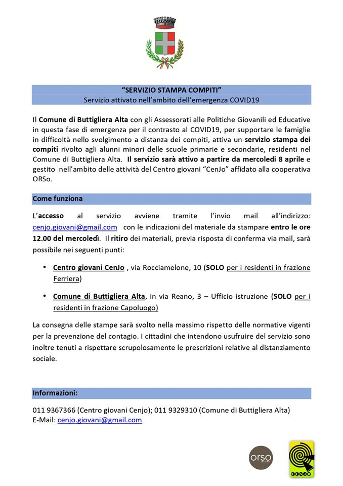 L'Amministrazione prolunga il servizio di stampa compiti inaugurato negli scorsi mesi di didattica a distanza, per agevolare le famiglie in difficoltà ad avere una copia cartacea dei compiti delle vacanze, assegnati dalle scuole. Il servizio è gestito dal CenJo, in collaborazione con la Orso CooperativaSociale. Le modalità di accesso al servizio nel volantino allegato.