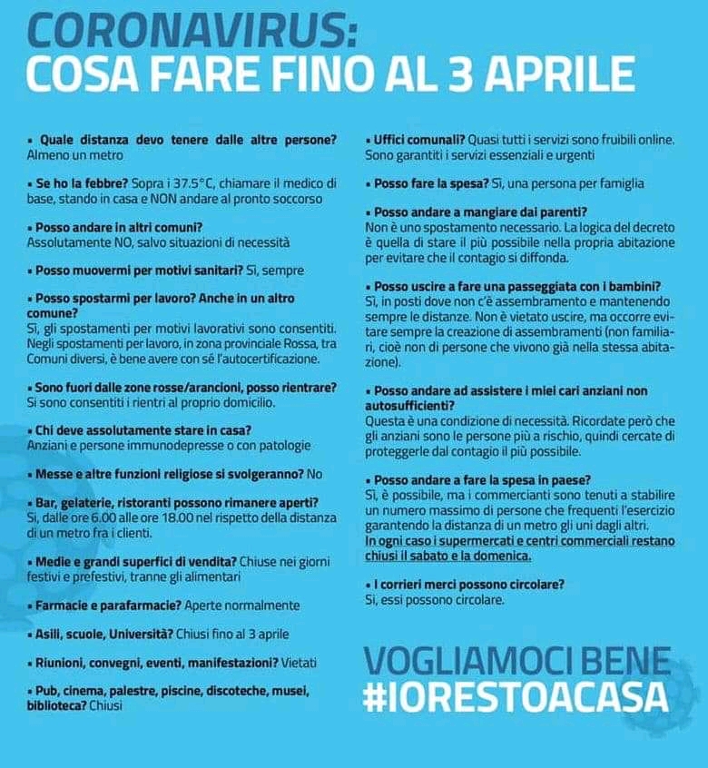 Come avete appreso dai principali mezzi di informazione, con l'entrata in vigore del nuovo DPCM 9 marzo 2020 tutta la nostra Nazione è entrata in zona rossa.