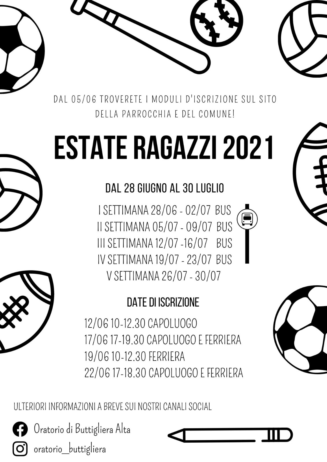 Per quanto concerne la fascia delle scuole primarie e secondarie di primo grado, saranno accolti presso il plesso Brizio di corso Laghi dal 28 giugno al 30 luglio, con possibilità, anche in questo caso, di fruire della giornata intera o della mezza giornata e del servizio di trasporto da Ferriera. Informazioni e iscrizioni al Centro Famiglia parrocchiale (via Reano) sabato 12-6 dalle 10 alle 12,30; giovedì 17-6 dalle 17 alle 19,30; martedì 22-6 dalle 17 alle 18,30 e all’oratorio Sacro Cuore (via Gatta) giovedì 17-6 dalle 17 alle 19,30; sabato 19-6 dalle 10 alle 12,30 e martedì 22-6 dalle 17 alle 18,30, sui canali social Facebook e Instagram dell’oratorio di Buttigliera Alta.