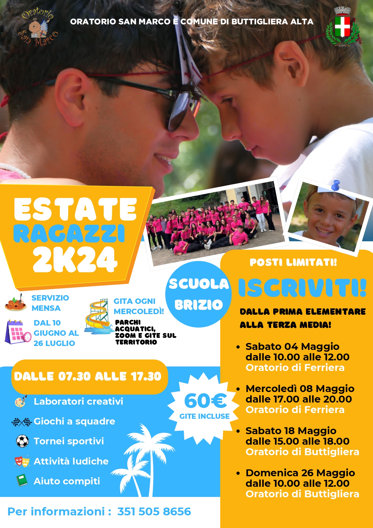E' pronto il calendario dell'edizione 2024 di "Estate Ragazzi": il centro estivo promosso dal Comune e dall'Oratorio San Marco per i bambini e i ragazzini che hanno frequentato le scuole primarie e secondarie di primo grado. Le attività prenderanno il via da lunedì 10 giugno fino a venerdì 26 luglio, presso il plesso "Brizio", in corso Laghi, con orario 7,30 - 17,30. Il costo è di 60€ a settimana con sconti per i residenti e i fratelli.