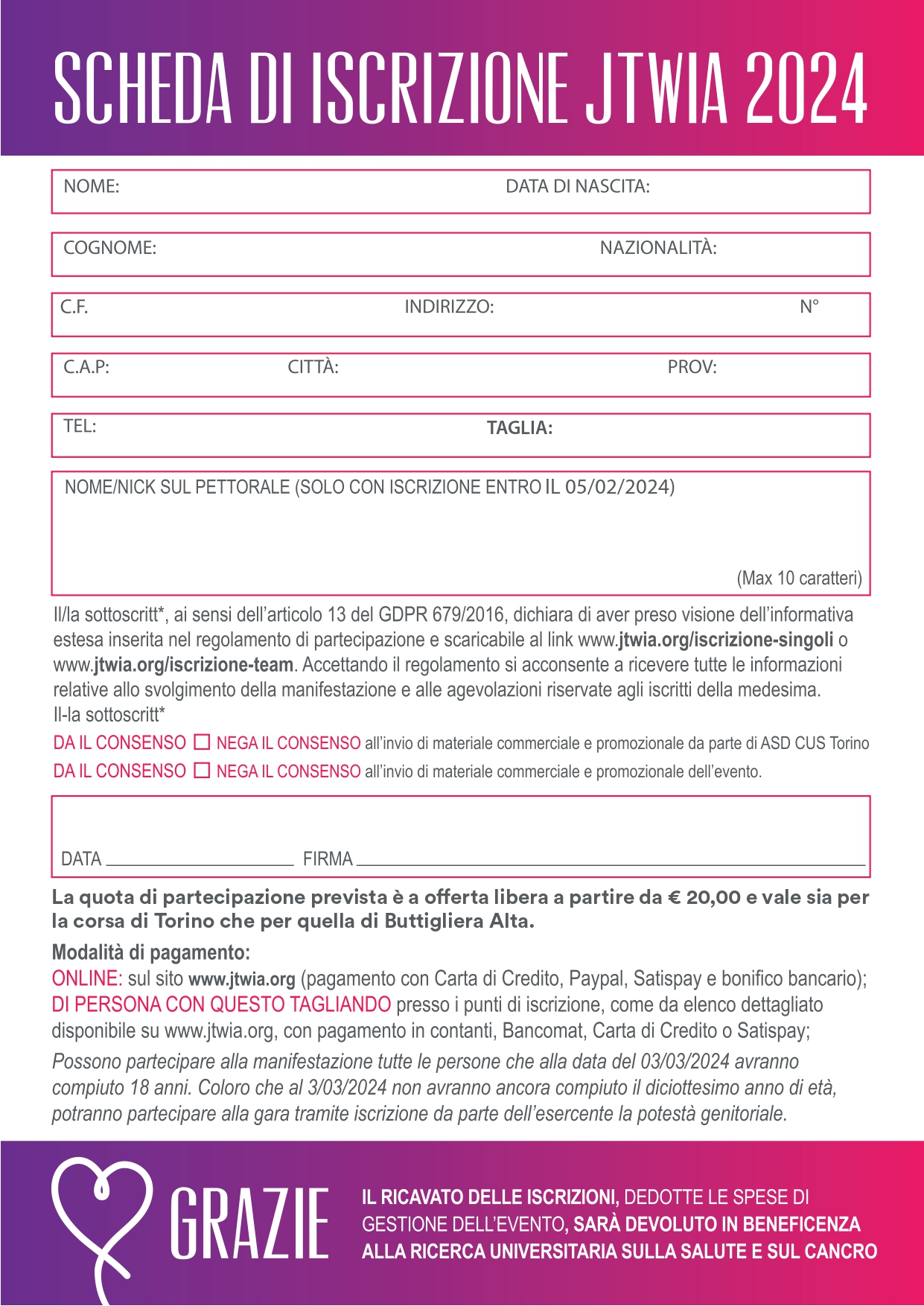 E possibile iscriversi (quota di partecipazione di 20€ - il ricavato sarà devoluto alla ricerca universitaria contro il cancro), utilizzando il modulo allegato, on-line sul sito www.jtwia.org o in presenza presso i seguenti punti: