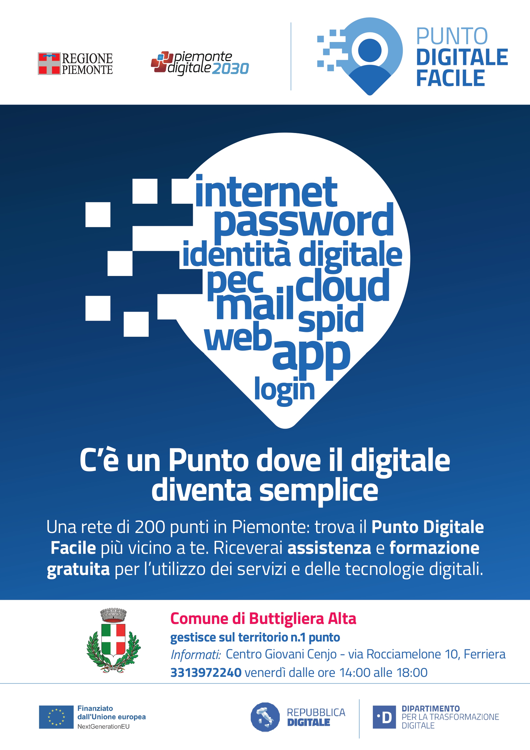 Si ricorda che presso il Cenjo, il centro di aggregazione giovanile comunale, è attivo il "Punto digitale facile": il nuovo servizio gratuito rivolto a tutti i cittadini, finanziato dalla Regione Piemonte con i fondi del PNRR.