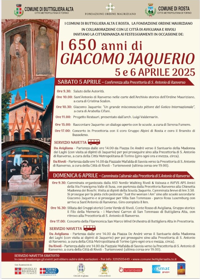 Evento organizzato dalle Amministrazioni Comunali di Buttigliera Alta e Rosta, con la Fondazione Ordine Mauriziano, la collaborazione delle Città di Avigliana e Rivoli e il Patrocinio del Consiglio Regionale del Piemonte e della Città Metropolitana di Torino. Location d’obbligo per ospitare le celebrazioni dell’artista, la precettoria di Sant’Antonio di Ranverso, che accoglie una delle testimonianze più fulgide dell’opera jaqueriana: il ciclo di affreschi che decorano la chiesa e l’ex sacrestia. L’evento si inserisce in un cruciale frangente di riqualificazione del polo artistico e culturale di Ranverso, oggetto di un’importante serie di investimenti e restauri, curati dalla Fondazione Ordine Mauriziano.