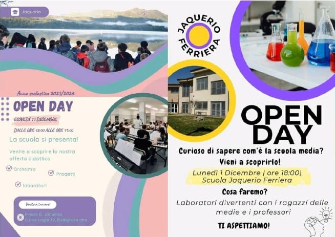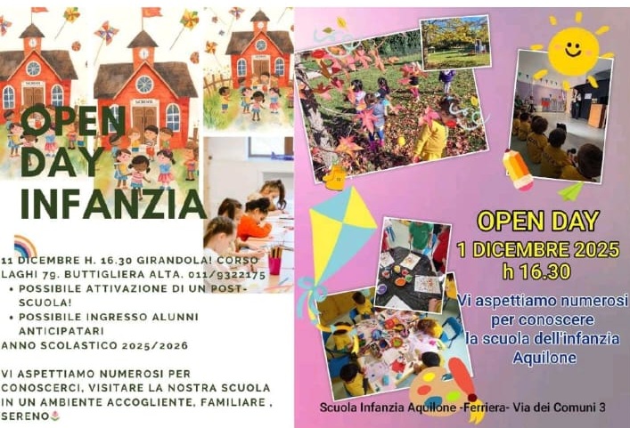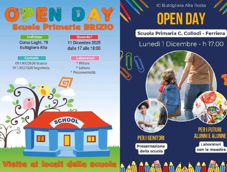 Si comunicano le date degli Open Day delle scuole dell'infanzia, primarie e secondarie di primo grado delle sezioni buttiglieresi dell'Istituto Comprensivo Buttigliera Alta Rosta.