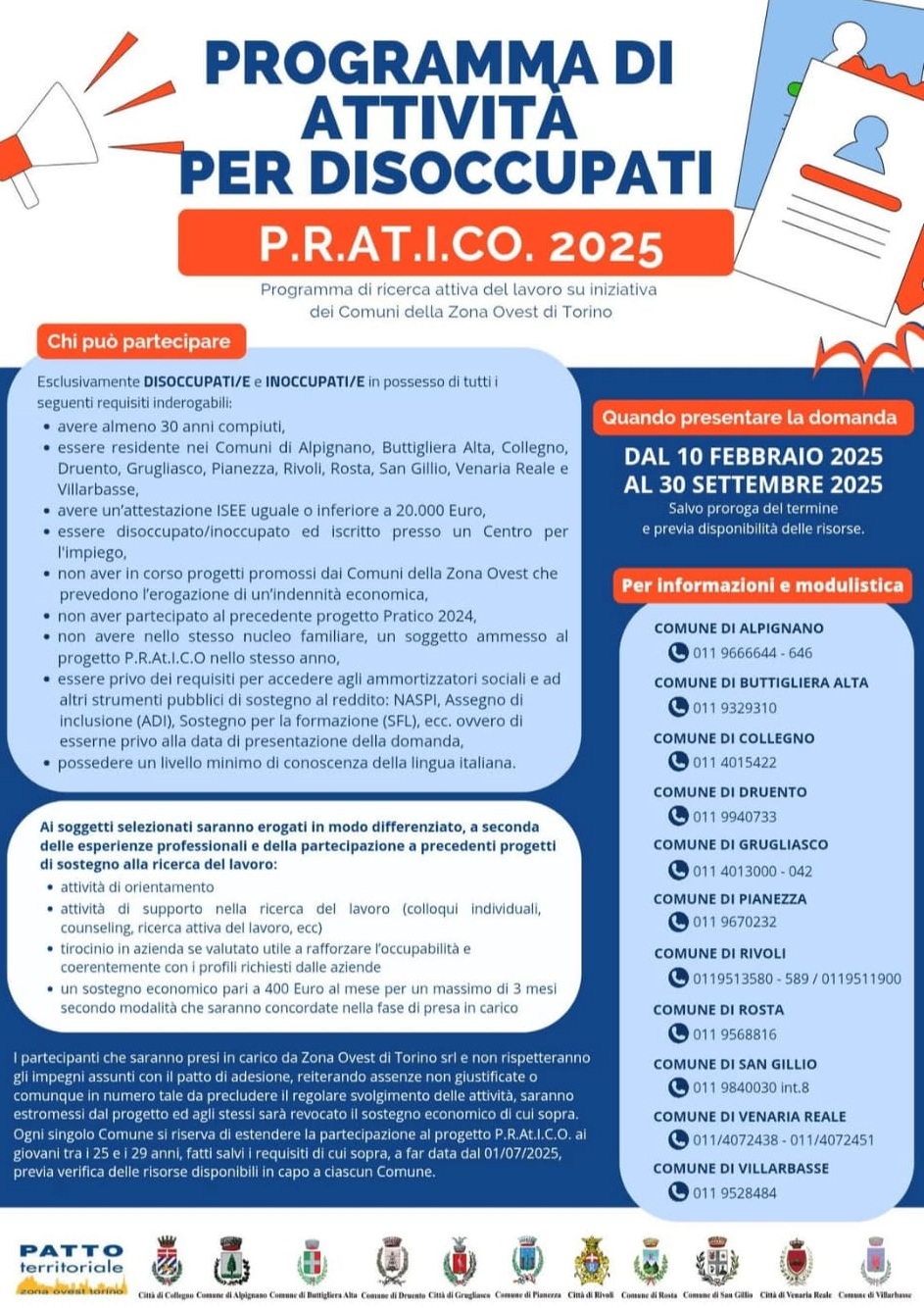 Torna, anche per il 2025, il progetto Pratico rivolto ai disoccupati o inoccupati over 30, finalizzato alla ricerca attiva del lavoro, promosso dal "Patto territoriale zona ovest Torino".