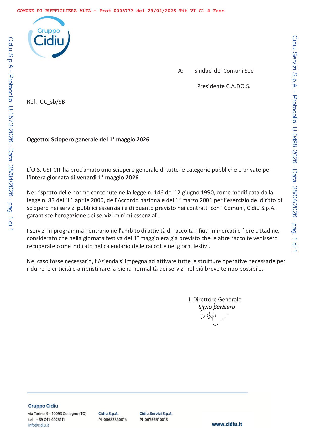 Avviso di possibili disservizi nella raccolta rifiuti causa sciopero generale di tutte le categorie pubbliche e private per l’intera giornata di venerdì 1° maggio 2026