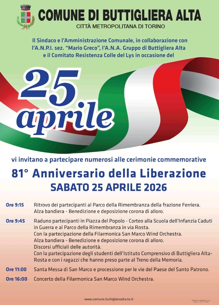 L'Amministrazione Comunale, in collaborazione con l'Anpi, l'Ana e il "Comitato Resistenza Colle Lys" promuove il programma delle celebrazioni dell'81° anniversario della Liberazione, sabato 25 aprile.
