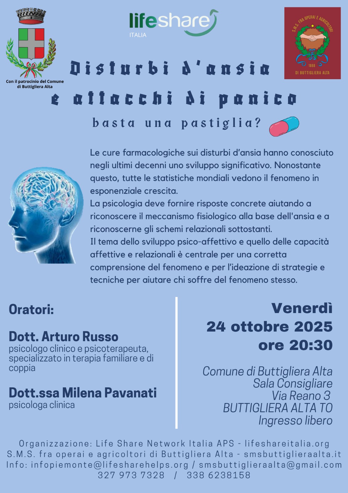 Nell'ambito del ciclo di iniziative promosse dall'Amministrazione Comunale per "Ottobre mese rosa della prevenzione", gli Assessorati alle Politiche della Salute e alle Pari Opportunità propongono, venerdì 24 ottobre alle 21, in municipio, un incontro promosso dalle Associazioni “Life share Italia” e Mutuo Soccorso sul tema “Disturbi d’ansia e di panico: basta una pastiglia?” con lo psicologo e psicoterapeuta dottor Arturo Russo e la psicologa clinica dottoressa Milena Pavanati.