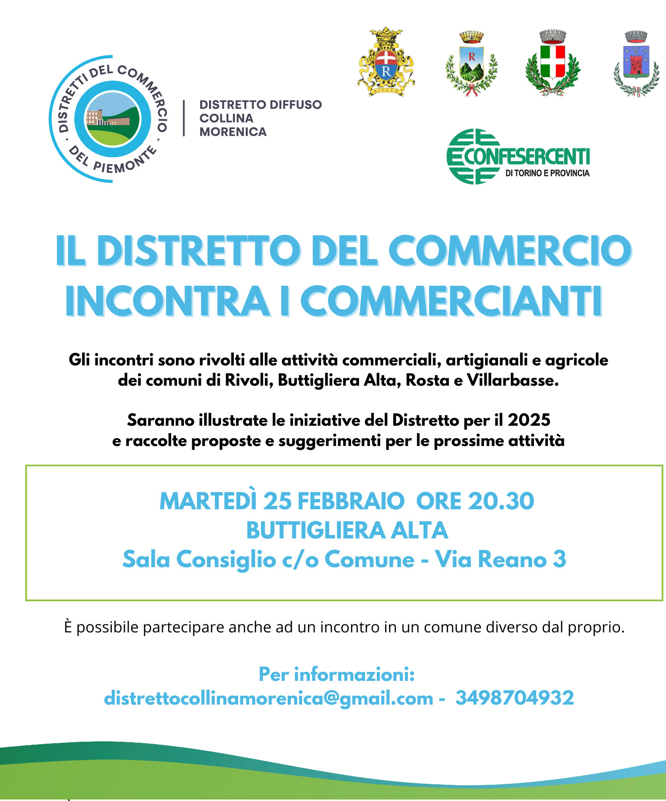 Il Distretto Commerciale Diffuso della Collina Morenica incontra i commercianti dei quattro comuni partner (Buttigliera, Rivoli, Rosta e Villarbasse) martedì 25 febbraio alle 20,30 presso la sala consiliare del municipio, in via Reano 3.