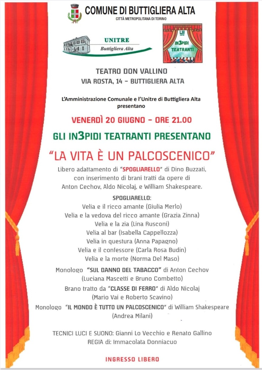 In occasione della Festa Europea della Musica, venerdì 20 giugno alle 21 presso il teatro "Don Vallino" di via Rosta 14, l'Amministrazione Comunale e l'Unitre buttiglierese presentano uno spettacolo della compagnia "Gli in3pidi teatranti": "La vita è un palcoscenico", adattamento di "Spogliarello" di Dino Buzzati con inserimenti di brani di opere di Cechov, Nicolaj e Shakespeare.