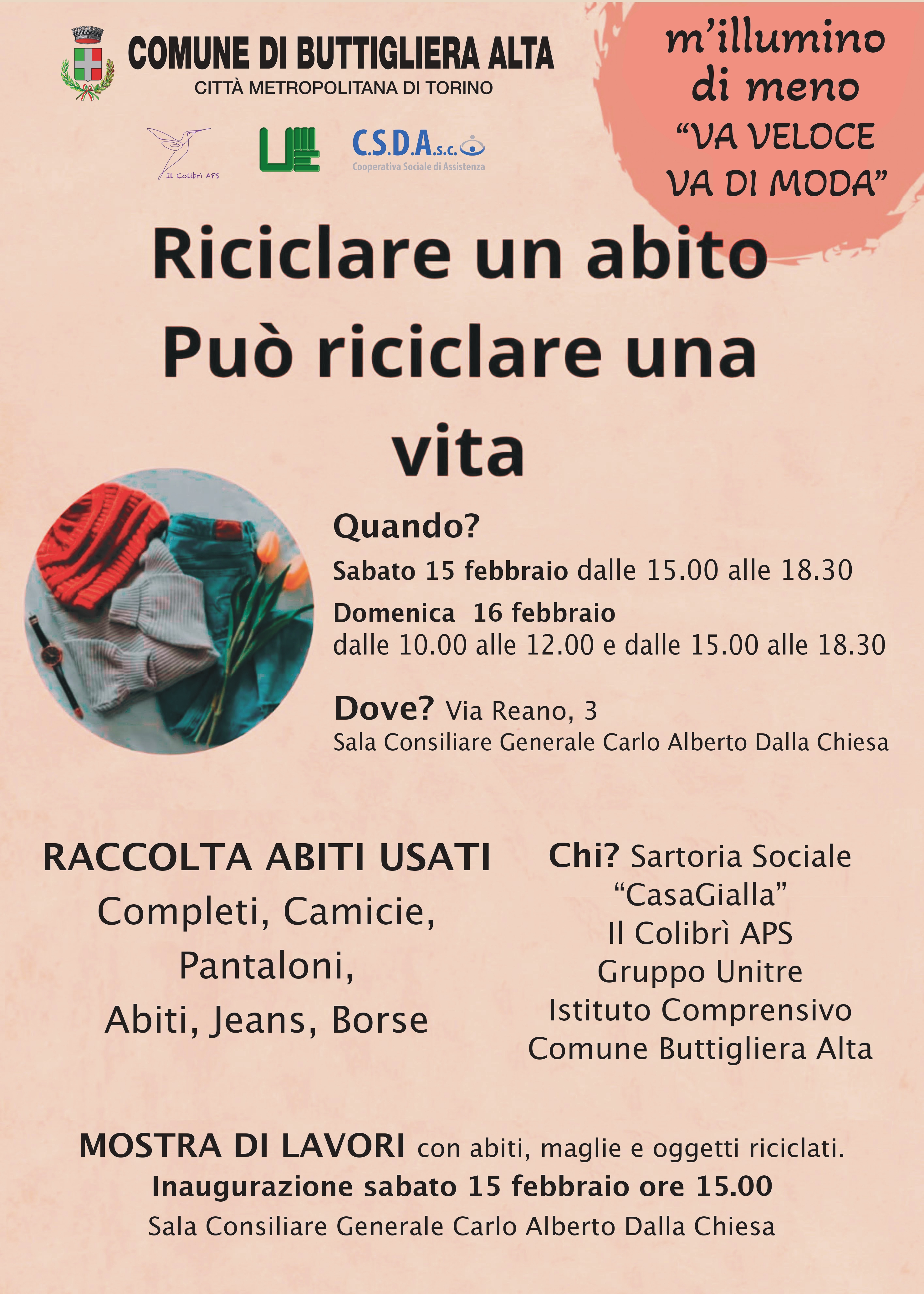 Tema dell’edizione 2025 il riuso tessile, riprendendo il claim “Va di moda”, scelto dalla trasmissione Radio Rai “Caterpillar”, da sempre promotrice dell’evento. L’invito è a non gettare capi di abbigliamento usati, ma ancora riutilizzabili, evitando di aumentare la massa di rifiuti e riducendo l’utilizzo di nuove materie prime, come buona prassi per uno stile di vita sostenibile. Principio concretizzato con week-end dedicato alla raccolta di abiti e accessori usati, sabato 15 dalle 15,00 alle 18,30 e domenica 16 dalle 10,00 alle 12,00 e dalle 15,00 alle 18,30 presso la sala consigliare del municipio, in via Reano 3. Abiti donati alle Associazioni solidali del territorio, che li risistemeranno e li doneranno alle famiglie in difficoltà economica. Sempre sabato 15, alle 15,00 in sala consigliare, sarà inaugurata una mostra di lavori realizzati con materiale tessile riciclato.