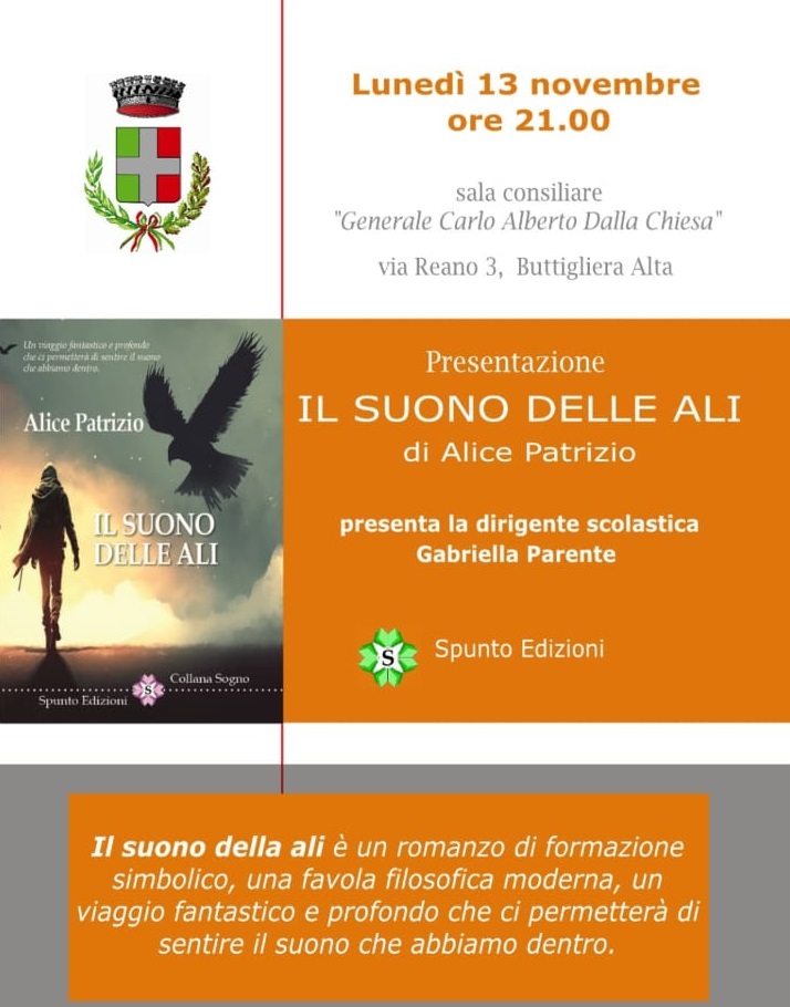 L'Amministrazione Comunale, con l'Assessorato alla Cultura e la biblioteca civica "Ida Carlini" propone una serata di promozione letteraria, con la presentazione del libro "Il suono delle ali" di Alice Patrizio (Spunto Edizioni), lunedì 13 novembre 2023 alle ore 21,00 presso la sala consiliare "Dalla Chiesa" del municipio, in via Reano 3.