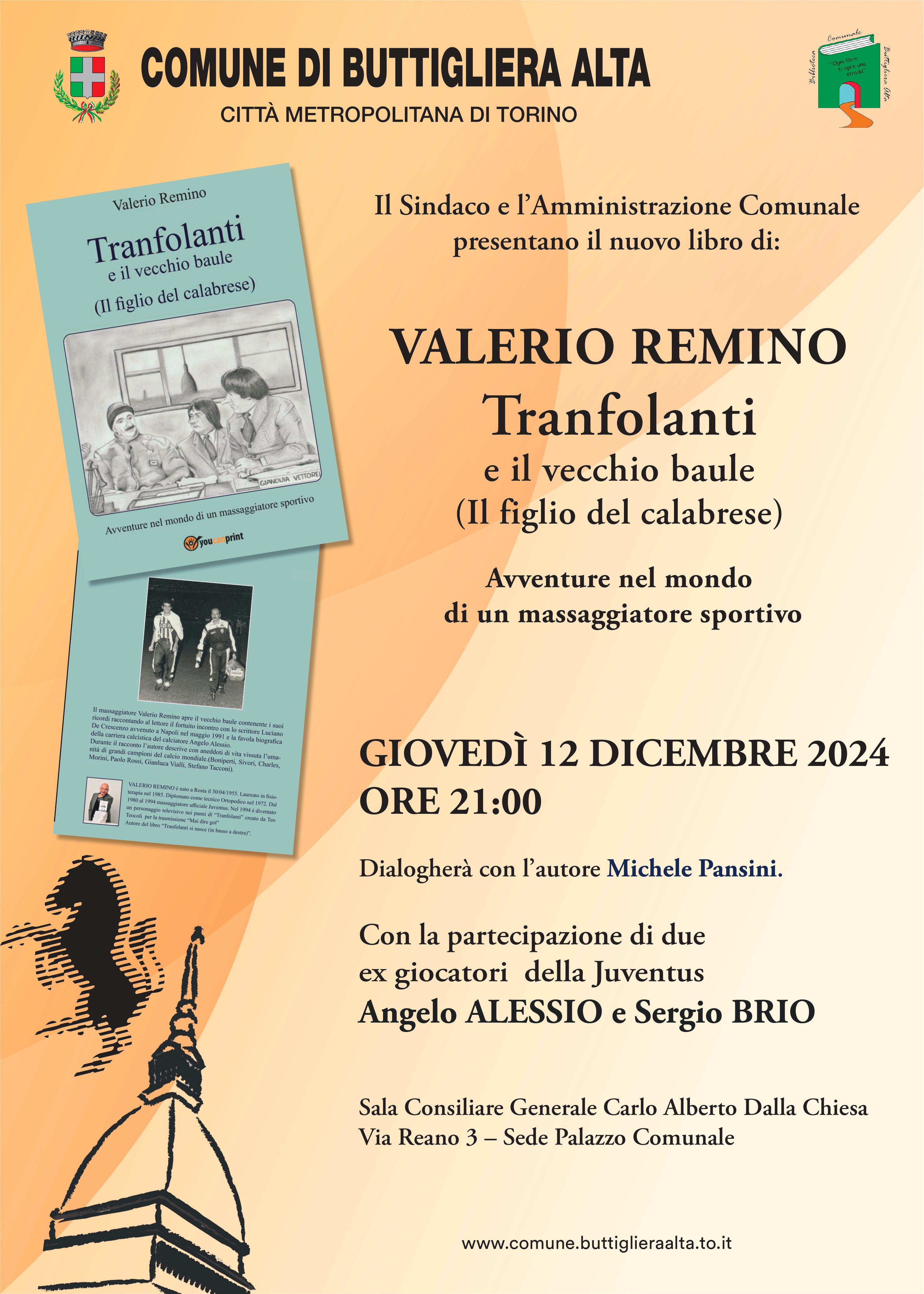 L'Assessorato alla Cultura con la biblioteca civica "Ida Carlini" presentano il nuovo libro di Valerio Remino: "Tranfolanti e il vecchio baule (Il figlio del Calabrese)", giovedì 12 dicembre alle 21 presso la sala consiliare del municipio, in via Reano 3.