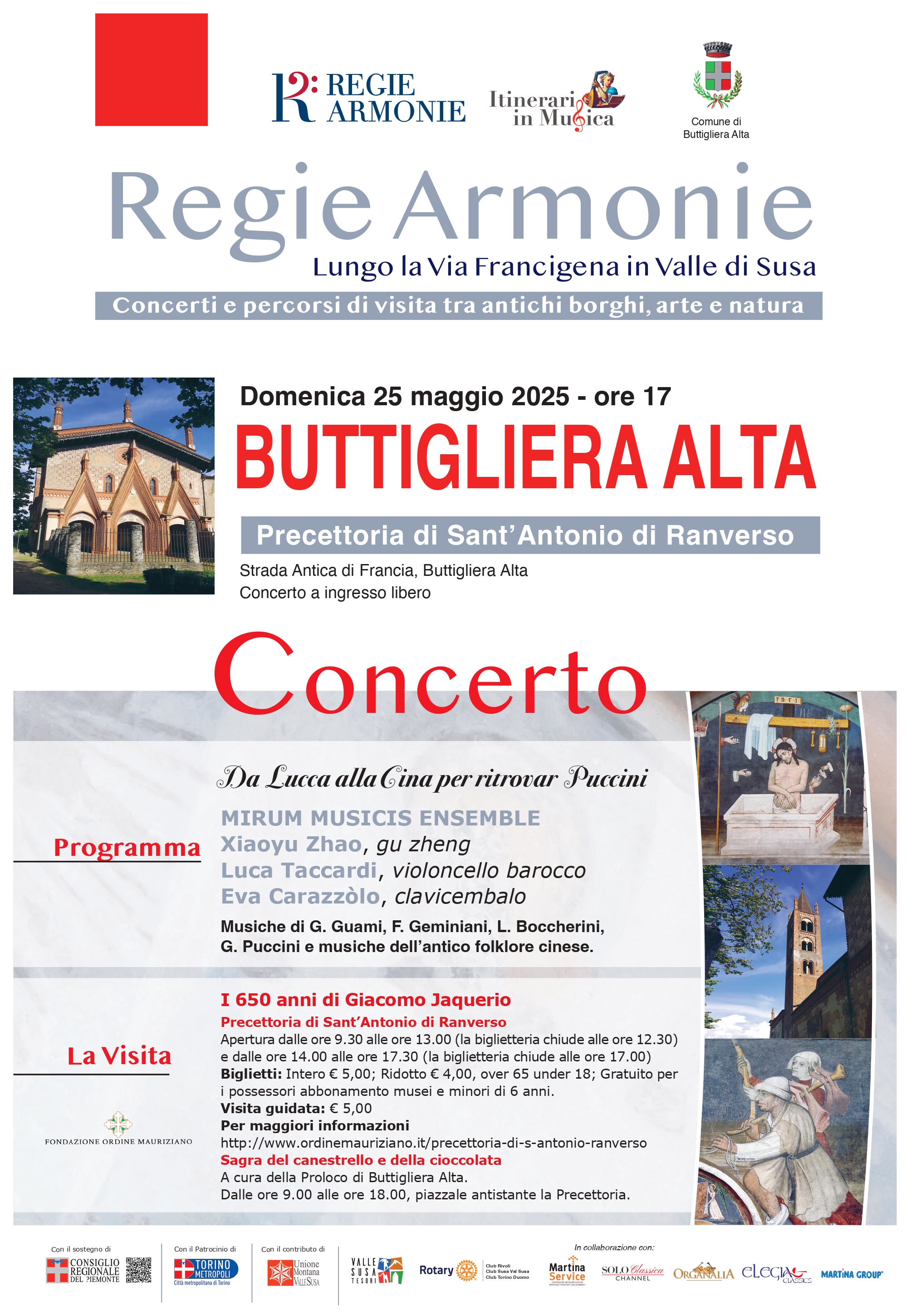 Itinerari in Musica con l'Amministrazione Comunale di Buttigliera Alta torna a proporre l'edizione 2025 di "Regie armonie lungo la Via Francigena" con un concerto di musica lirica e dell'antico folclore cinese, domenica 25 maggio alle 17 presso la chiesa della precettoria di Sant'Antonio di Ranverso.