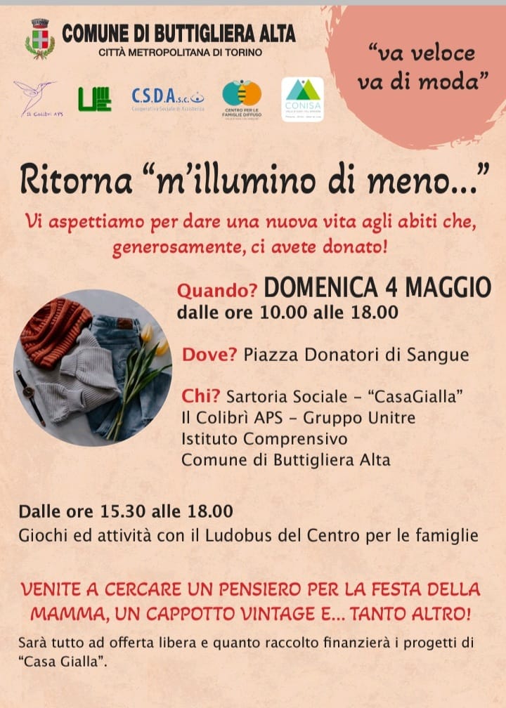 L'Amministrazione Comunale, in collaborazione con "Il colibrì Aps", Unitre Buttigliera Alta, Cooperativa Csda, Centro per le Famiglie Diffuso e il Conisa organizza, per domenica 4 maggio la riedizione di "M'Illumino di Meno", dando seguito a quanto avviato lo scorso febbraio, in occasione della “Giornata nazionale del risparmio energetico e degli stili di vita sostenibili”, dedicata al riuso tessile.
