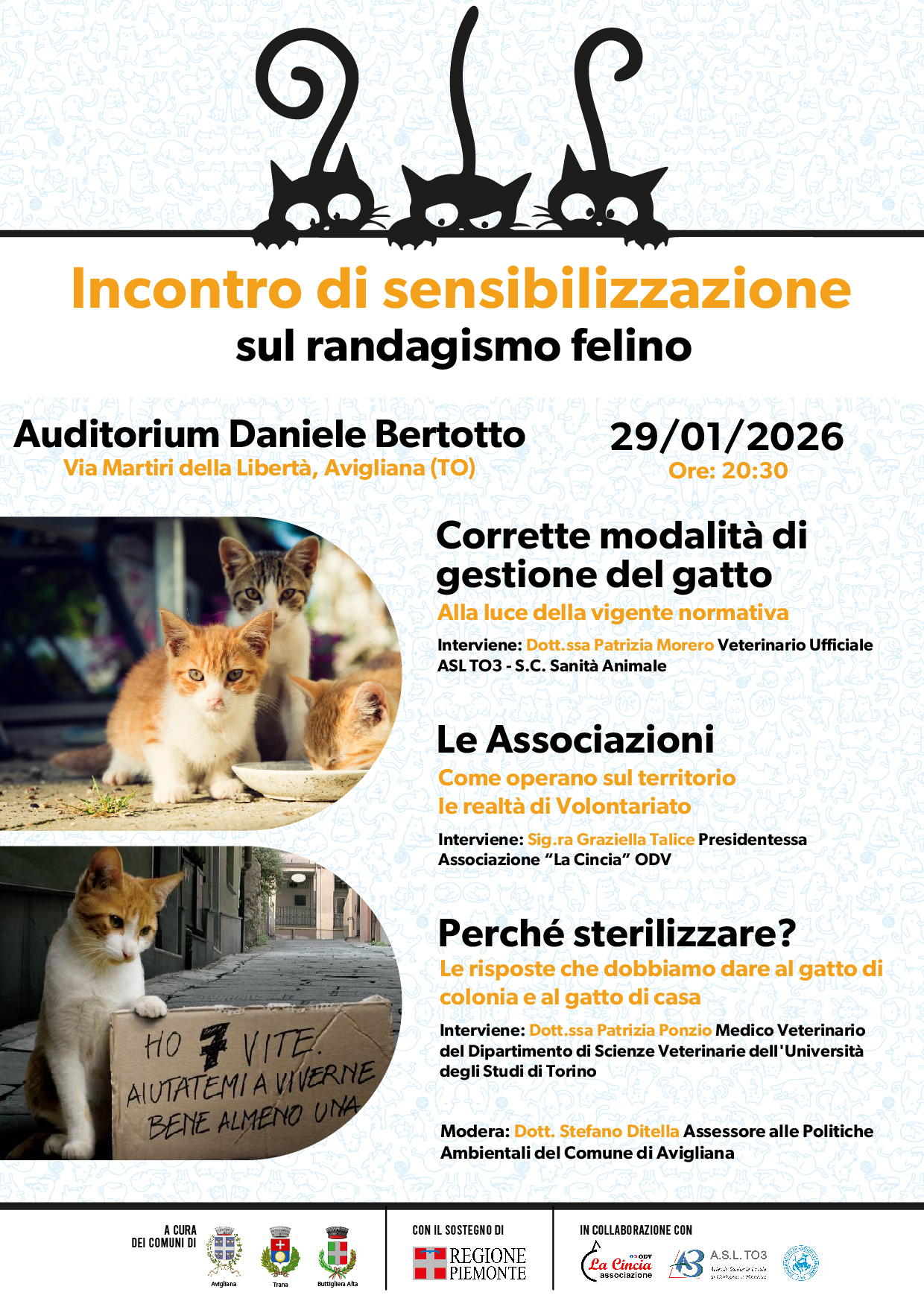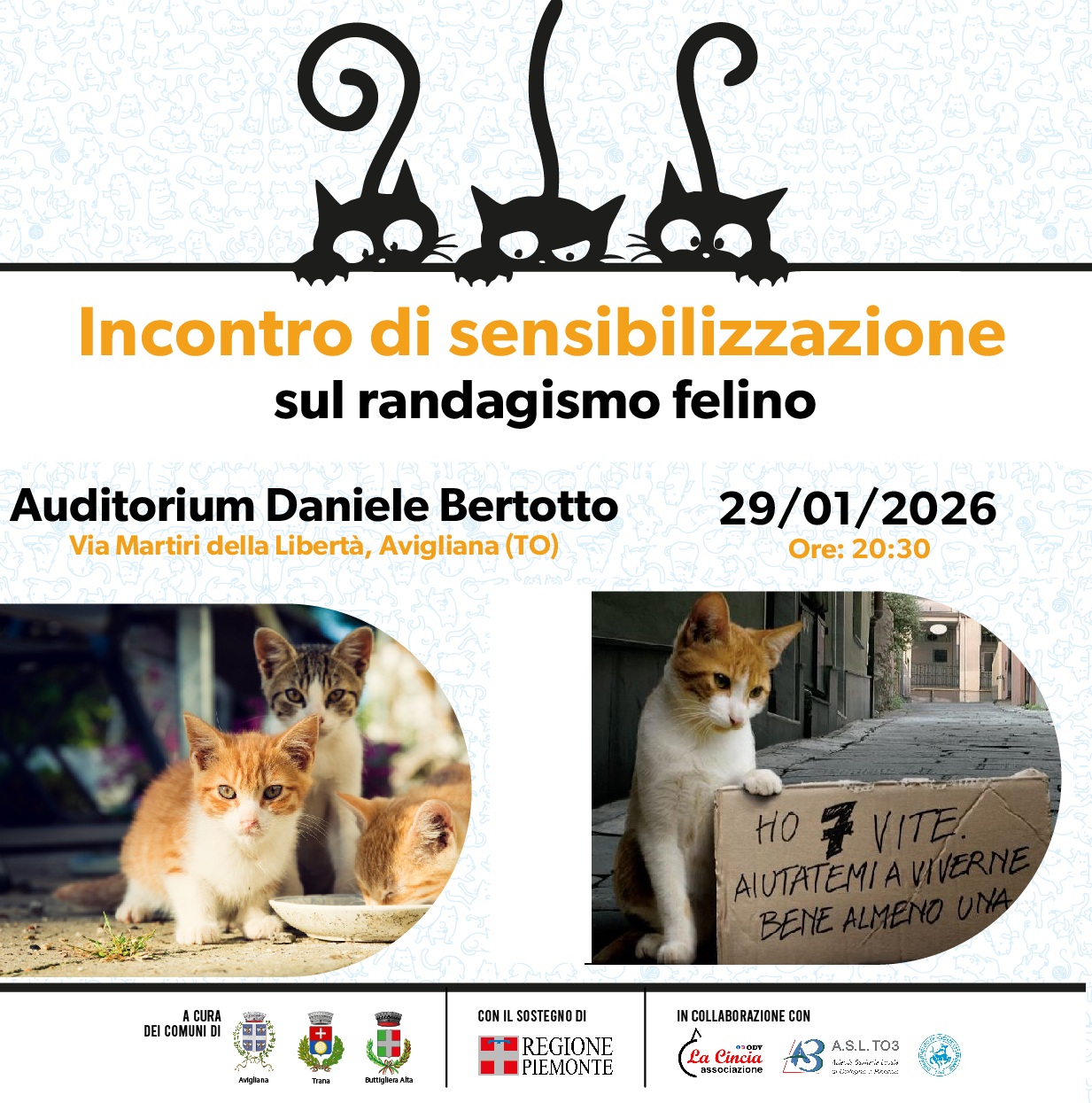 L'Amministrazione Comunale organizza in collaborazione con il Comune Di Avigliana un incontro di sensibilizzazione sul tema della tutela dei gatti sia domestici che non domestici con l'obiettivo di fornire informazioni sulla corretta gestione degli animali, in base alla più recente normativa.