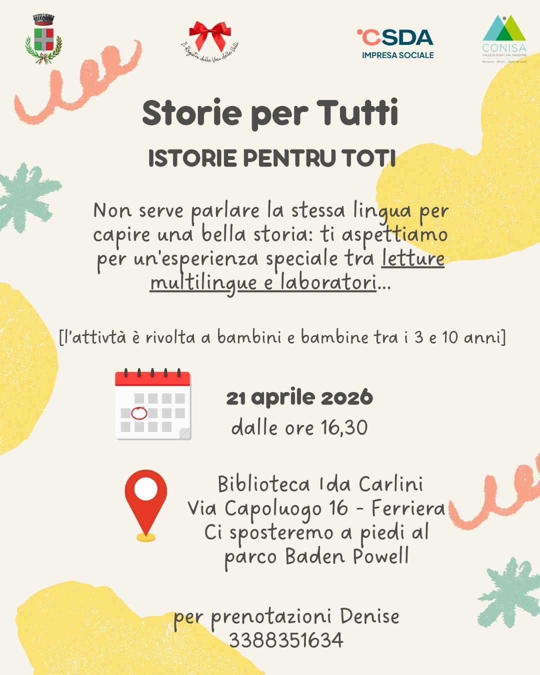 La Biblioteca Civica "Ida Carlini" organizza, con il Conisa - "Registro delle voci delle valli" e l'impresa sociale Csda un pomeriggio di gioco e intrattenimento multiculturale "Storie per tutti - Istorie pentru toti".