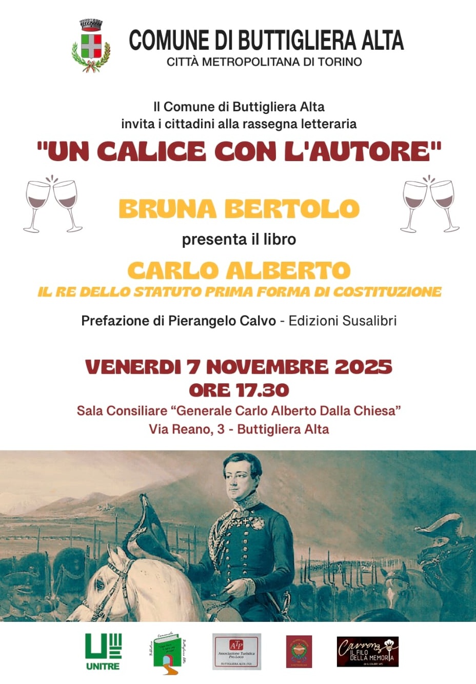 L'Amministrazione Comunale - Assessorato ala Cultura - in collaborazione con la biblioteca civica "Ida Carlini", l'Unitre, la Pro loco, "Il filo della memoria - de Il Colibrì Aps", nell'ambito della rassegna letteraria "Un calice con l'autore", la presentazione del libro di Bruna Bertolo "Calo Alberto - Il re dello Statuto, prima forma di Costituzione".